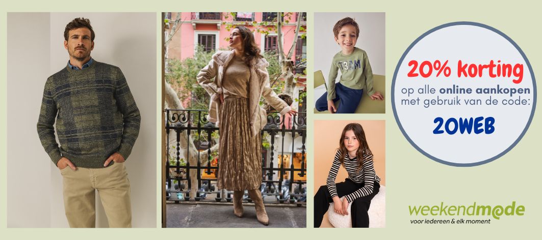 Bij WeekendMode vind je alle favoriete collecties voor dames, heren en kinderen. Welke stijl je ook zoekt: feestkledij, een sportieve outfit, zakelijke klasse of een outfit voor alledag. Bij WeekendMode vinden we het belangrijk om jullie een heel mooi assortiment te kunnen bieden. Daarnaast vind je ook nog een ruime keuze aan nachtkledij, ondergoed & lingerie, badmode, kledingaccessoires en lifestyle.